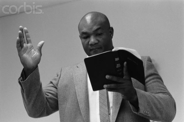 1977, Houston, Texas, USA — Heavyweight boxer George Foreman holds a Holy Bible as he preaches at his church on Lone Tree Road. — Image by © Michael Brennan/CORBIS Compartilhe 😀Clique para enviar um link por e-mail para um amigo(abre em nova janela)Clique para compartilhar no Facebook(abre em nova janela)Clique para compartilhar no Twitter(abre em nova janela)